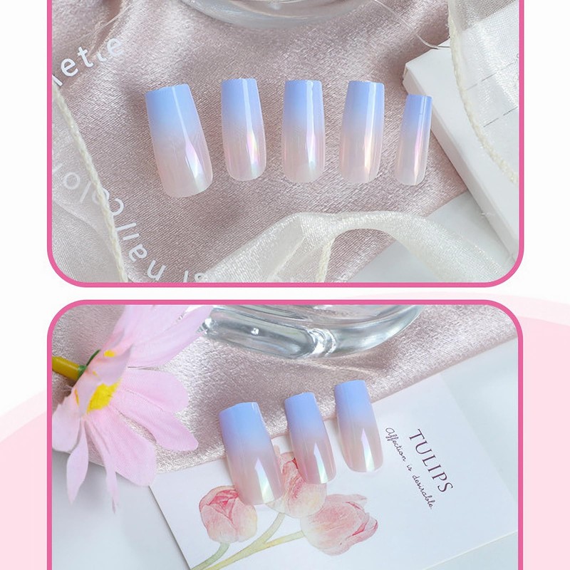 - 【Unique Design】 According to the most popular elements of the moment, these long square press on nails are designed with summer blue ombre chrome.