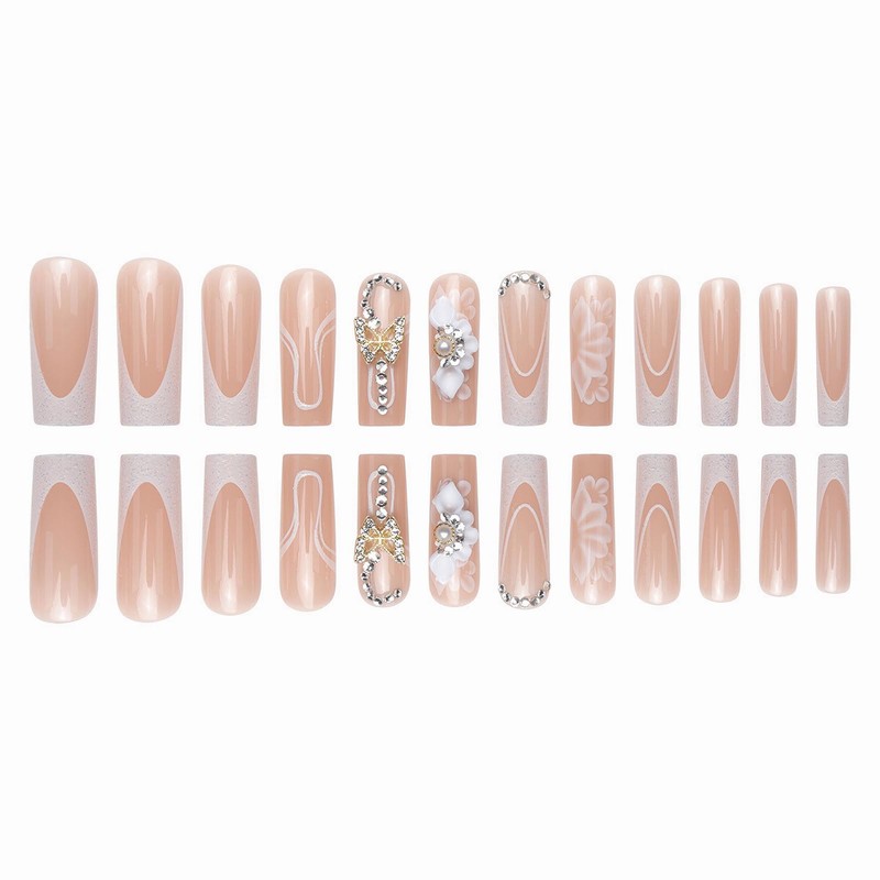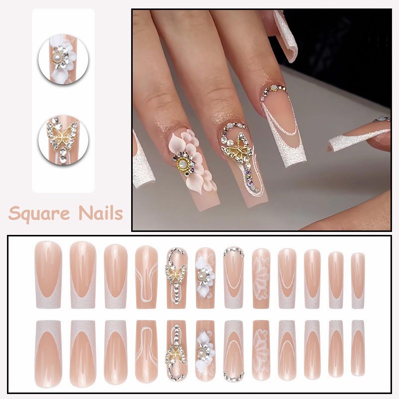 - 【Unique Design】 According to the most popular elements of the moment, these long square press on nails are designed with sparkly glitter sequins, white french tip and luxury flower butterfly diamond.