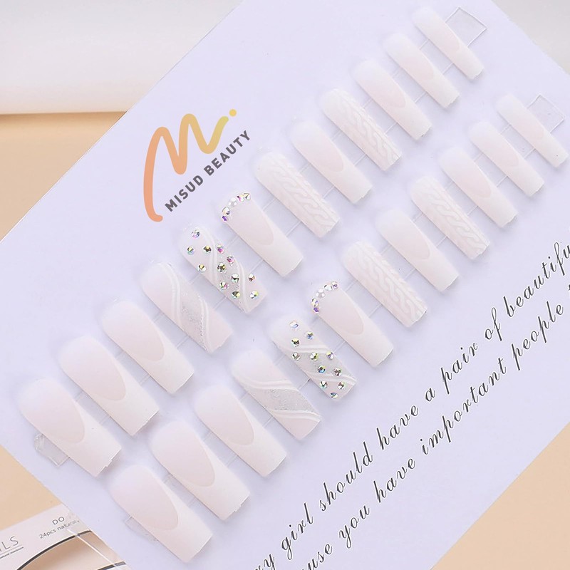 MISUD Press on Nails Long Square Fake Nails Matte Glue on Nails White French Tip Acrylic Nails Squoval Artificial Nails Rhinestone False Nails with Swirl Design for Wedding 24 pcs