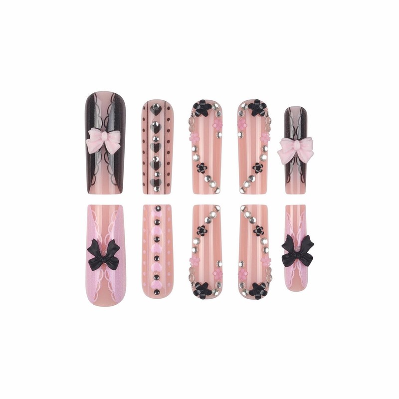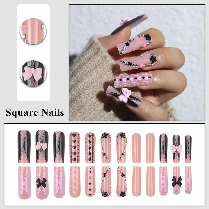 - 【Unique Design】 According to the most popular elements of the moment, these long square press on nails are designed with sexy pink black lace, luxury flower rhinestone and bow.