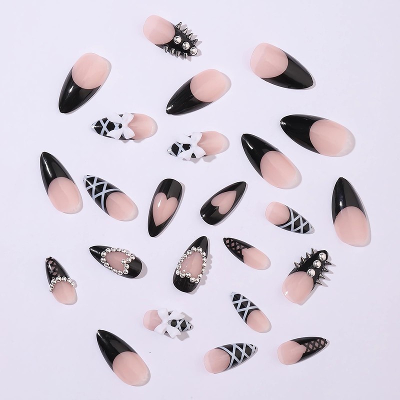 - 【Unique Design】 According to the most popular elements of the moment, these medium almond press on nails are designed with black french tip, diamond and bow.