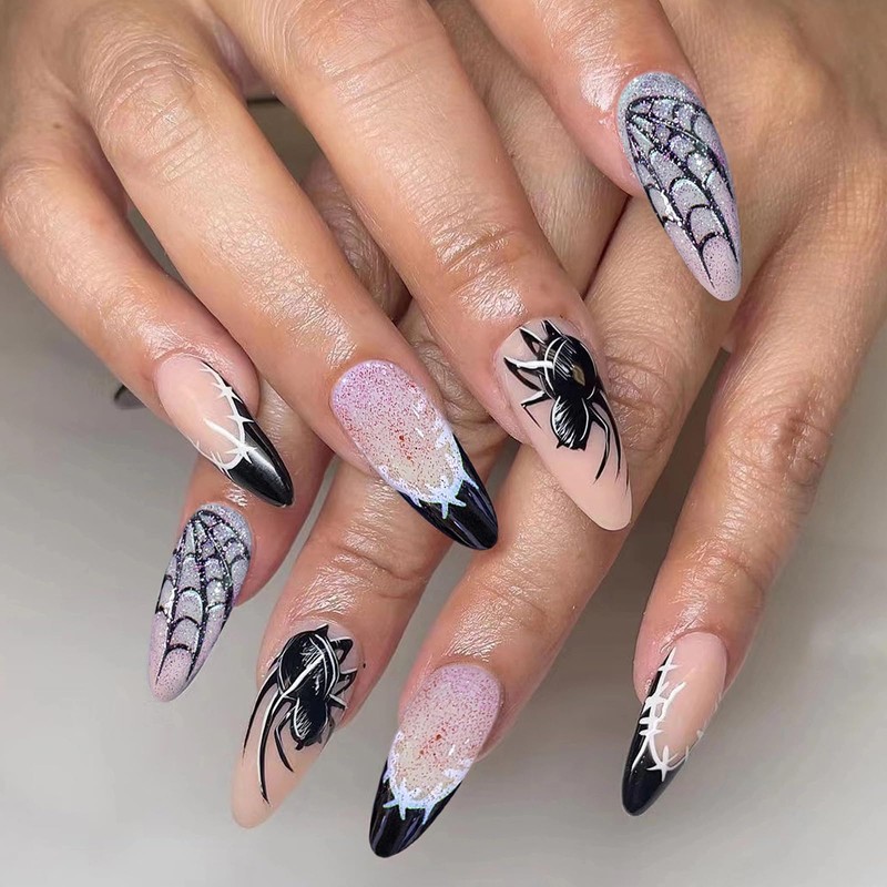 - 【Unique Design】 According to the most popular elements of the Halloween, these medium almond press on nails are designed with black french tip, goth spider web and bling glitter.