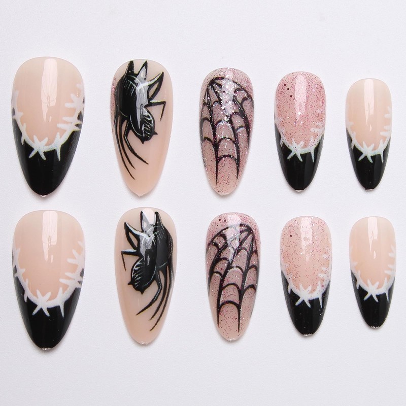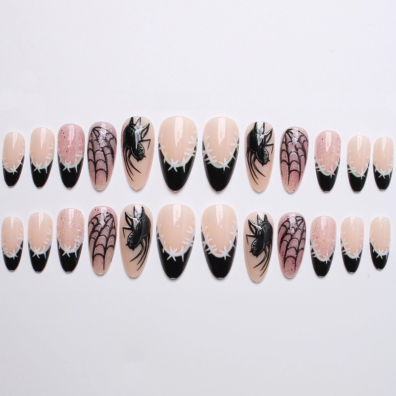 - 【Unique Design】 According to the most popular elements of the Halloween, these medium almond press on nails are designed with black french tip, goth spider web and bling glitter.