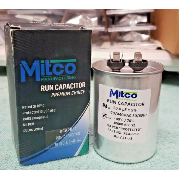 Mitco Run Capacitor 50 MFD x 370/440 VAC Round Mitco Model RCAPR50