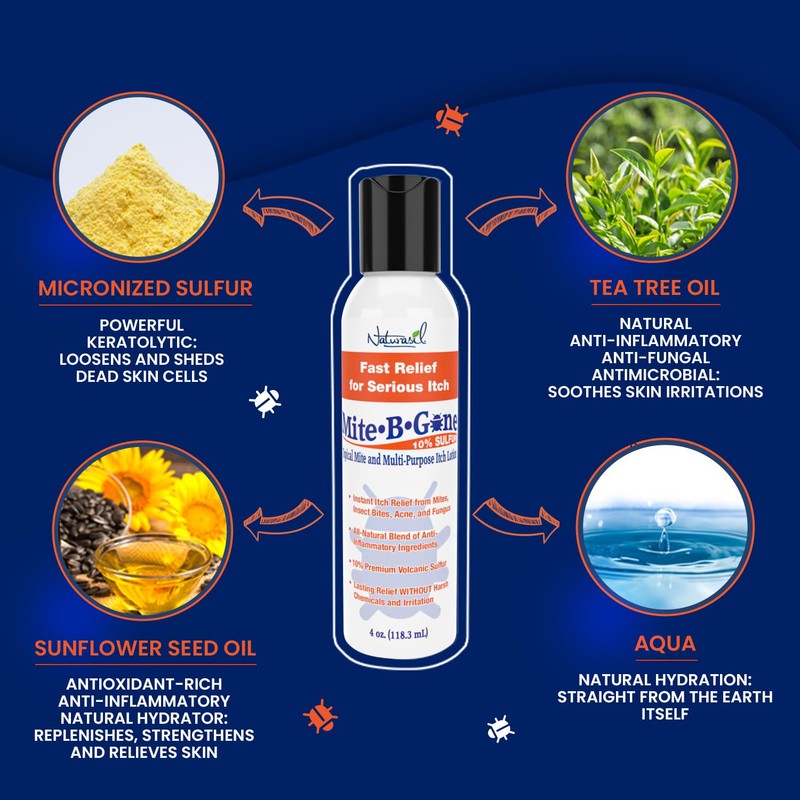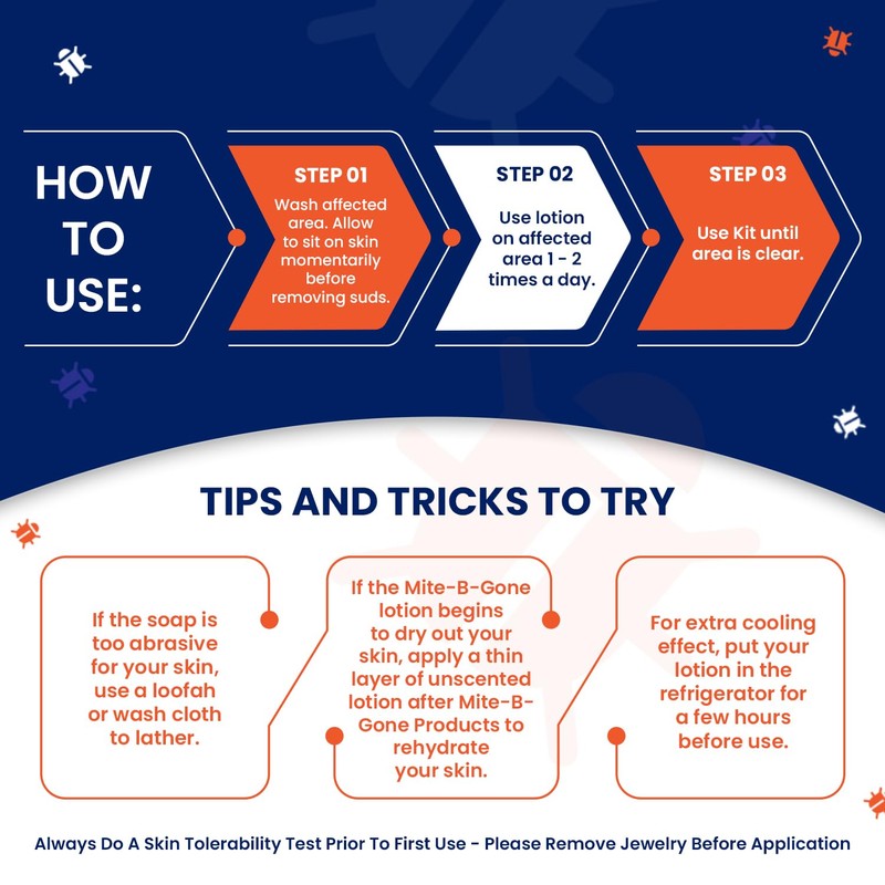 - Mite-B-Gone lotion gives you lasting relief WITHOUT any harsh chemicals or irritation.