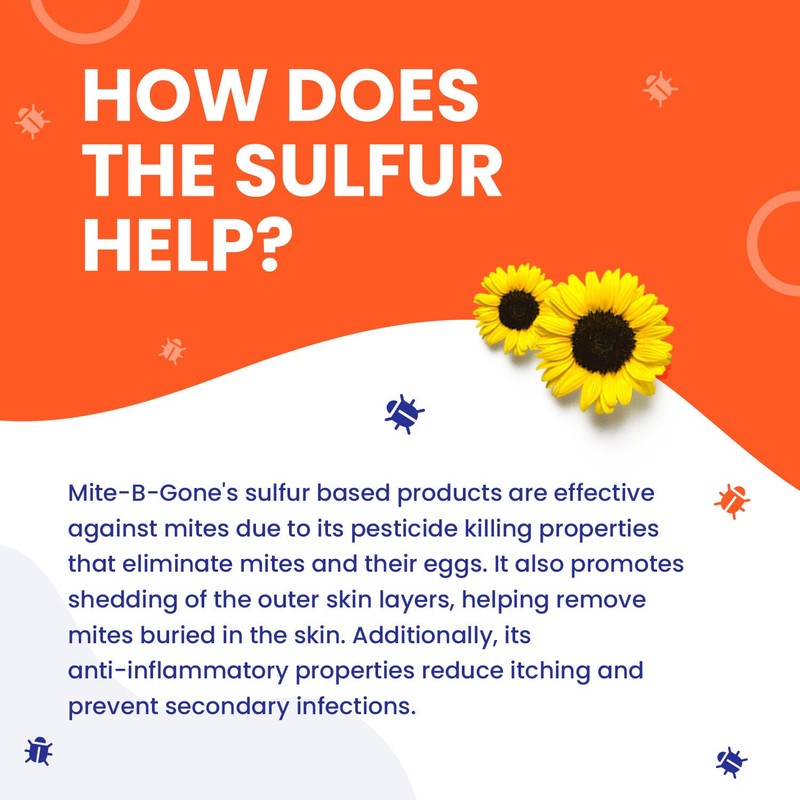 - Mite-B-Gone Sulfur Cream is a natural blend of nourishing essential oils and botanicals that bring quick itch relief from bug bites, acne, seborrheic dermatitis, and eczema, as well as skin discomfort and nail irritations.