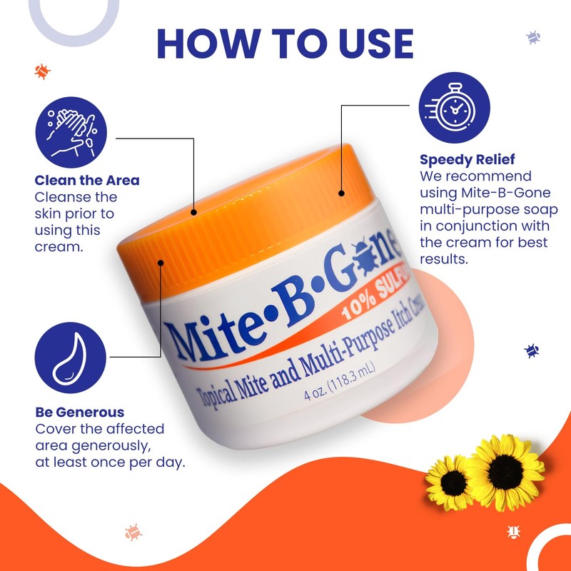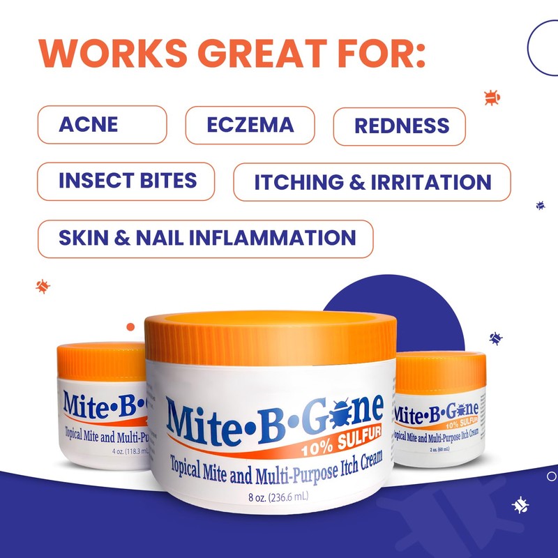 - MITE-B-GONE IS EXACTLY WHAT YOU NEED TO STOP THE ITCH: Our product is a natural blend of micronized volcanic sulfur, nourishing essential oils and botanicals that bring quick itch relief from mites, bug bites, acne, seborrheic dermatitis, and eczema, as well as skin discomfort and irritations.