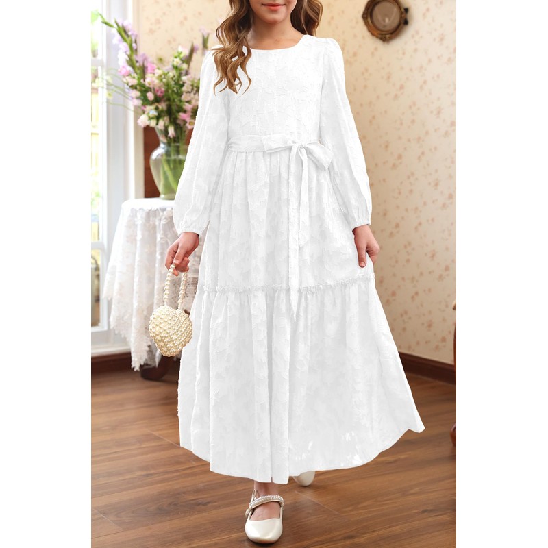 MITILLY Fall Flower Girl Dress for Wedding Formal Long Sleeve Crew Neck A-Line Elastic Waist Boho Party Maxi Dresses with Belt 6 Years White