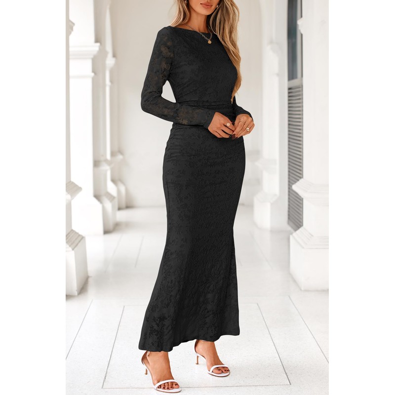 MITILLY Women's Formal Long Sleeve Dress Fall Elegant Floral Bodycon Ruched Cocktail Party Maxi Dresses Large Black