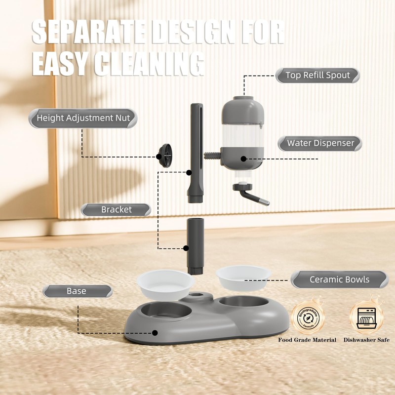 The dog food and water bowls with stand and water dispenser bottle are removable, easy to get cleaned. Enjoy the happy time with your pets without troublesome cleanning jobs.