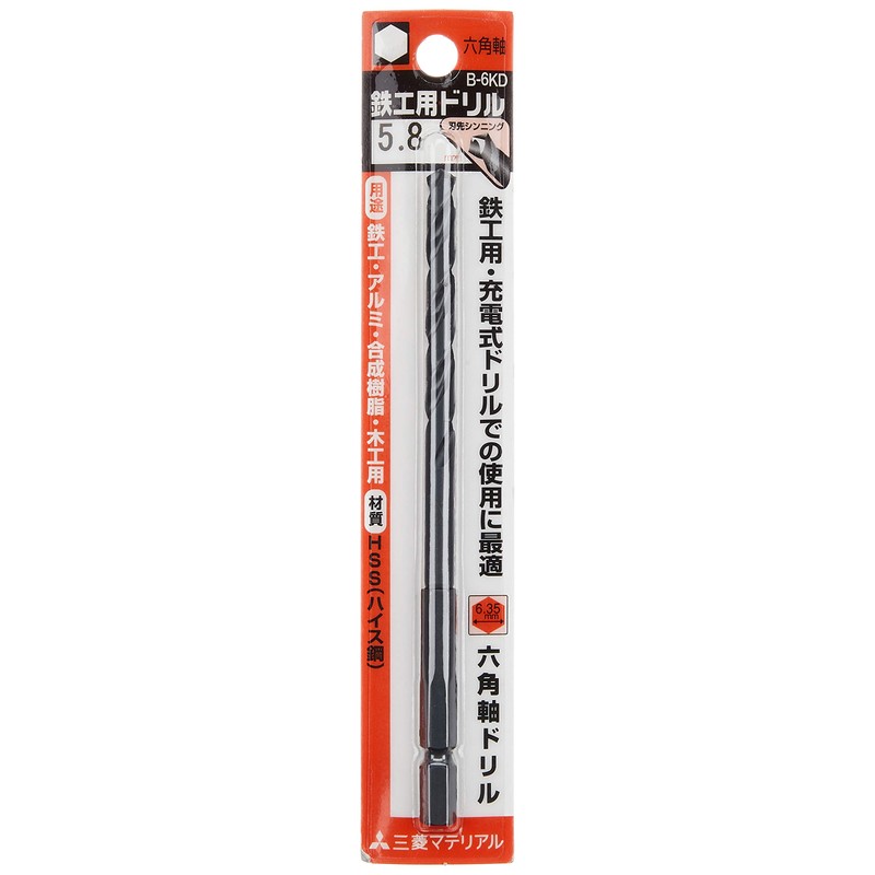 For drilling holes in iron (general steel). [Uses] Drill for drilling holes in iron steel, light alloy, aluminum, wood, and resin. [Functions and Features] The handle is a screwdriver bit type, so it can be put on and taken off with one touch. Thinning treatment is applied to the edge of the blade, so it can be lightly processed in your hands. Recommended Materials: Steel, aluminum, wood, resin. Compatible machines: Electric drills and rechargeable drills. Hole depth: Up to 5 times the diameter of the drill [Specifications] Blade Size: 0.2 inches (5.8 mm). Shaft: 0.25 inch (6.35 mm) hex shank Blade Processing: Thinning. 1 piece Total length: 4.8 inches (123 mm). Groove length: 2.2 inches (56 mm) Material: High Speed Steel (HSS). Product Size (W x H x D): 0.1 x 0.6 x 0.1 inches (3 x 16.5 x 3 mm); Weight: 1.1 oz (30 g); Product Code: 4994196043971; JAN Code: 4994196043971; Brand Name: Mitsubishi; Product Name: Hexagonal Shaft Drill; Standard: 5.8 mm; Standard: 5 mm; Note: Cannot be used on heat-treated materials (hardened steel, etc.)