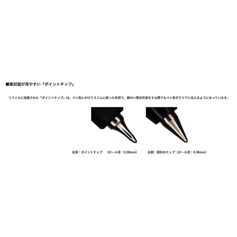 The "point tip" attached to the refill is slim and narrow through the nib, so the tip can be seen clearly, even when performing fine writing work.