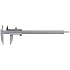 The caliper has a dual vernier scale, with both the upper and lower scales measuring in inch units. A 14-degree vernier face angle improves visibility and helps prevent parallax error in measurement reading. The caliper’s two sets of jaws provide the capability to make OD and ID measurements, as well as step measurements, where the butt end of the fixed jaw measures one end of a work piece before its upper/lower or inner/outer steps are measured. A depth measuring blade with rounded edges provides the ability to make depth measurements. The scales are raised to slide easily and protect the graduation markings. A thumbwheel permits fast and easy measuring. A clamping screw on the upper scale rotates to control scale movement and locks to hold the sliding jaw’s position. The caliper is made of hardened, corrosion-resistant stainless steel with a satin chrome finish that helps reduce glare. The caliper meets Federal Accuracy Specifications GGG-C-111B.