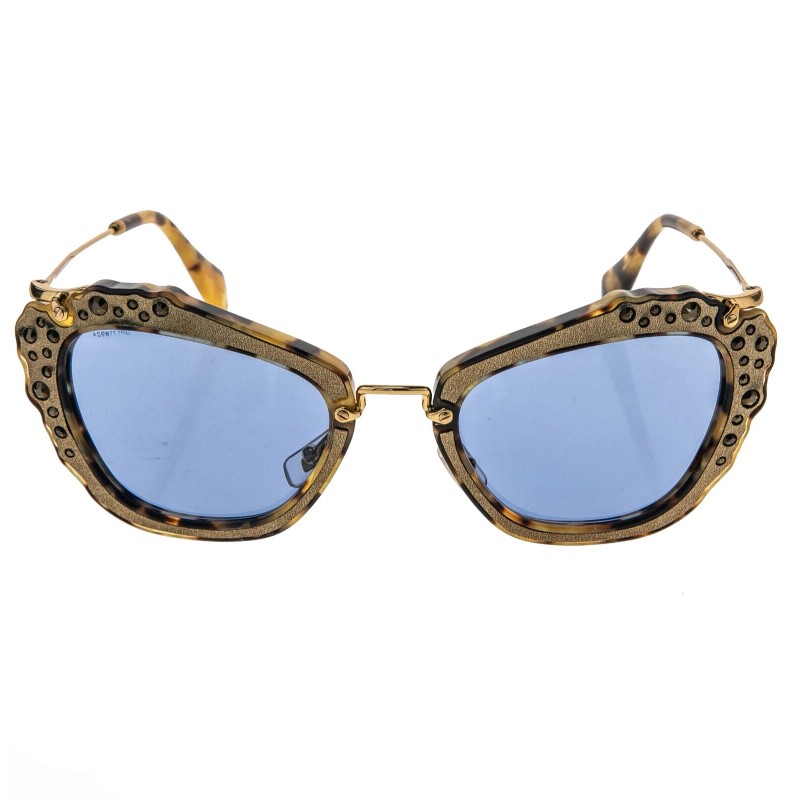 The unmistakable angled cat eye silhouette is dashed with micro-fine crystals. Larger stones are set on a new frilled edge. High metal temples signature to the collection are stamped with the Miu Miu logo