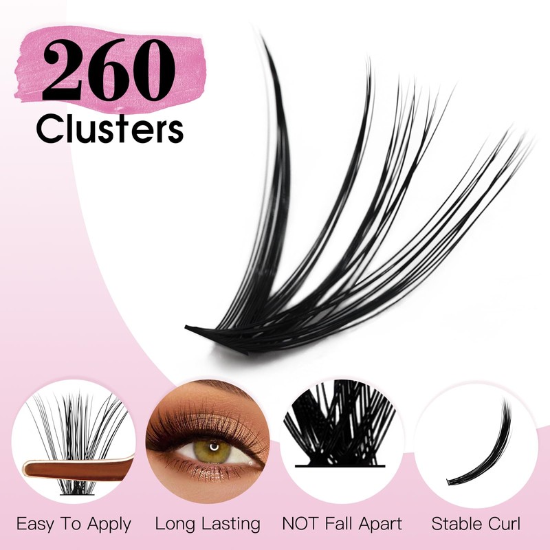 - DIY Lash Extension Kit for Self-Use: Including 260 pcs thin band lash clusters, 1 pcs cluster lash applicator, 1 bottle of strong hold lash bond and seal and cluster remover. Convenient for DIY eyelash extensions at home or on the go, easier and faster