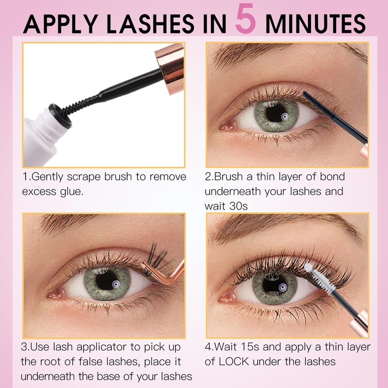 - Apply Lashes in 5 Minutes: Gently scrape off excess lash glue, brush your natural lashes with lash bond, then place cluster underneath your natural lashes for a comfortable and natural look, squeeze clusters against your lashes, wait 15s and apply lash seal to lock the bond