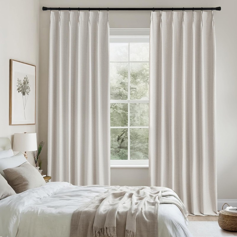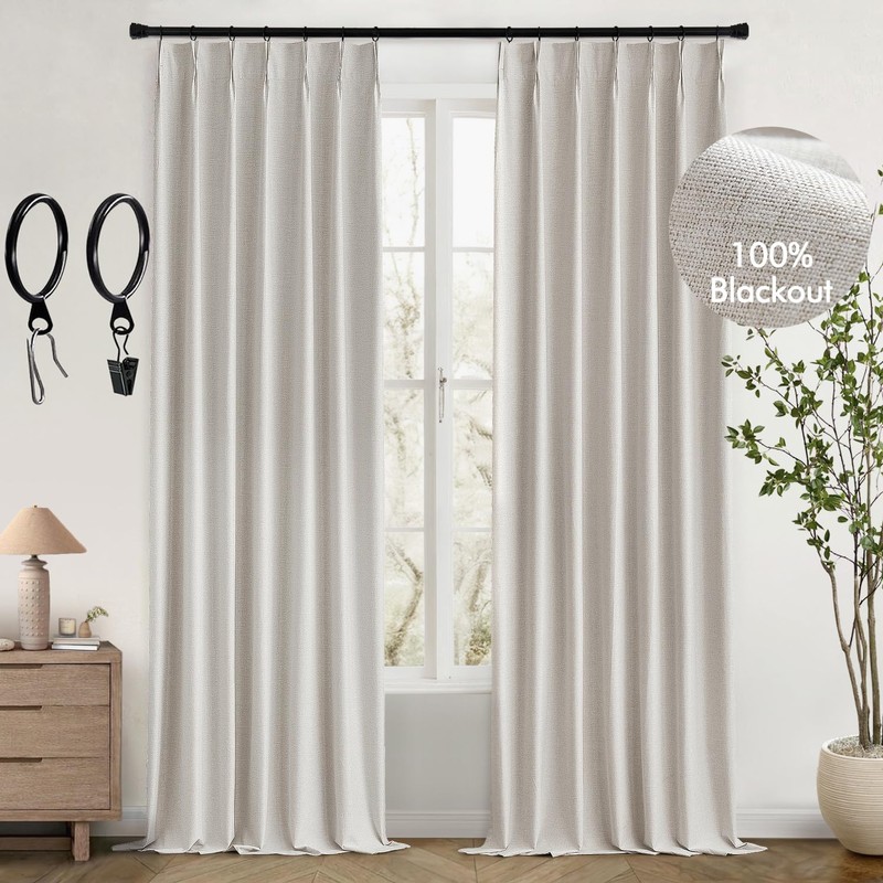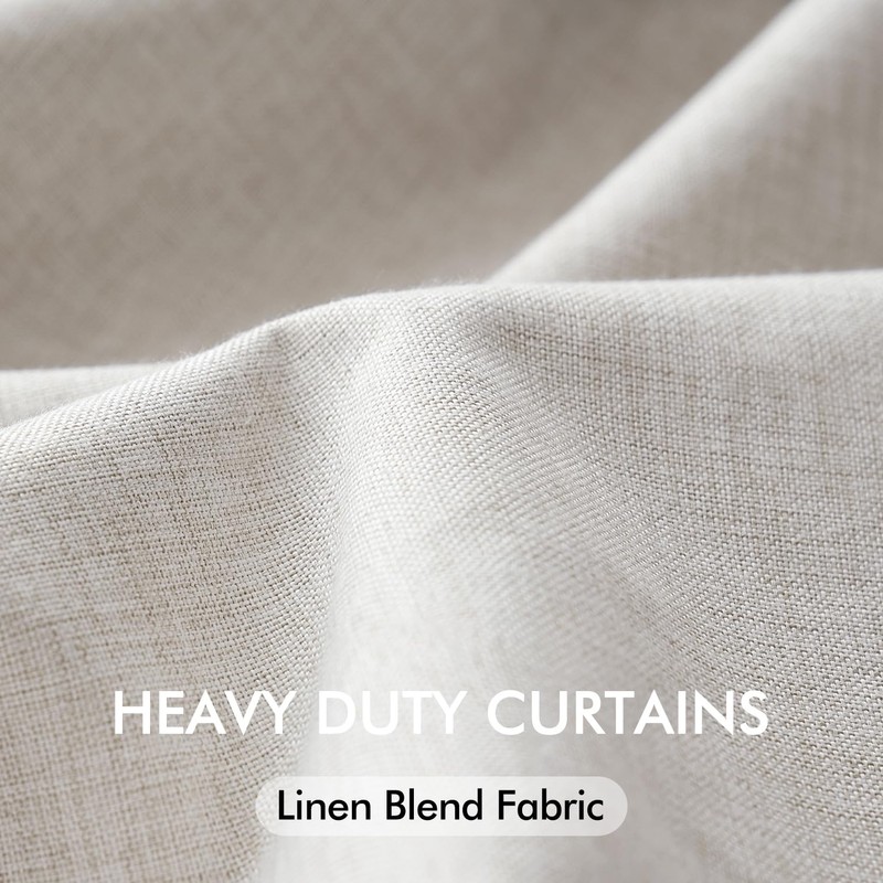 - MATERIAL: These blackout curtains are crafted from flax linen blend fabric with 100% blackout liner on the back. Linen textured material has visible linen flecks for a natural, textured and aesthetic look. With elegant pleat style, these modern curtains drapes well, perfect for a shabby chic, modern farmhouse, country chic, rustic, country, vintage room decor.