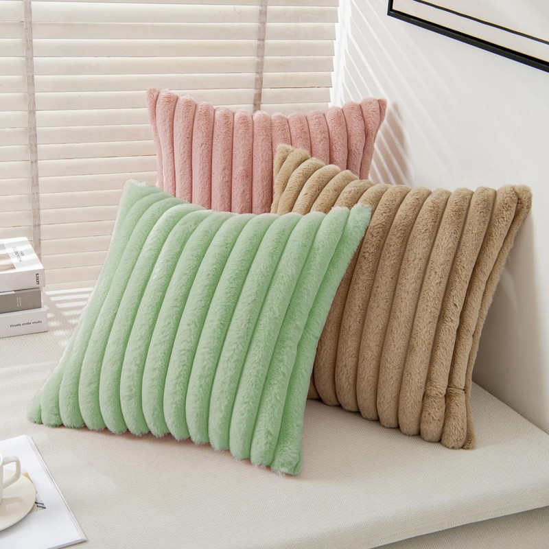 - Material:The front of the pillow cover is fluffy and soft faux rabbit fur striped, velvet on the back. Double sided are smooth and cozy.