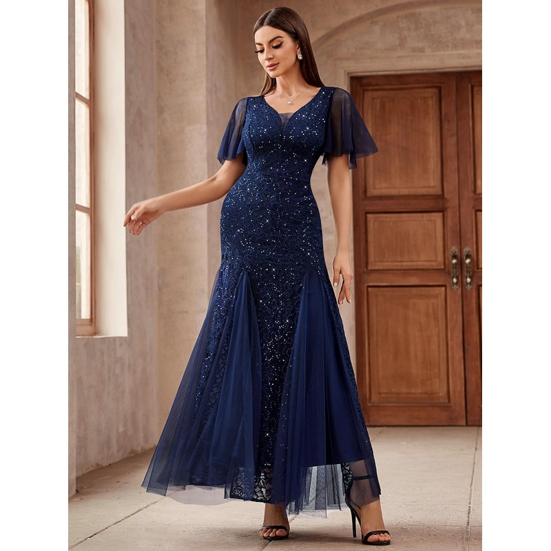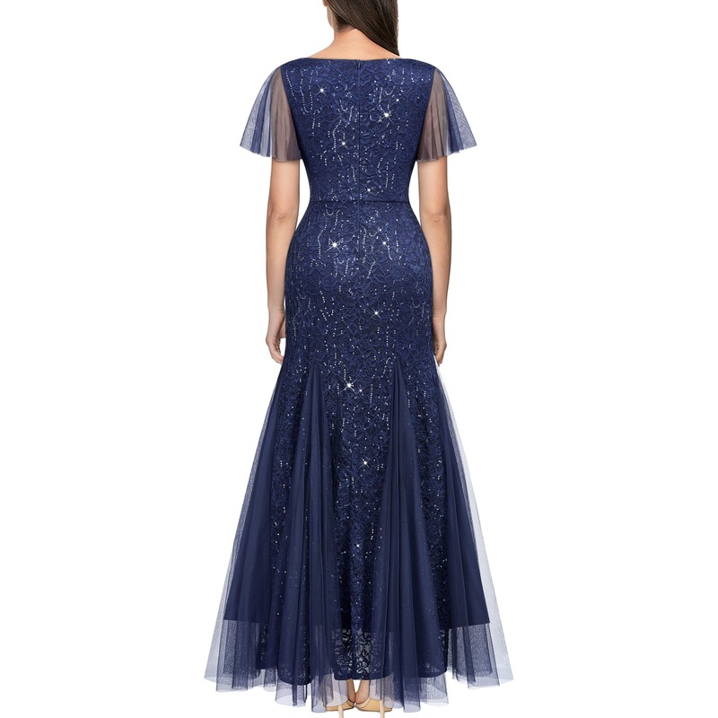 - Features: Sequin Lace, Deep V-neck, Ruffle Short Sleeve, Full Lace Style, Tulle Mermaid Hem, Maxi Dress, Zipper up Back
