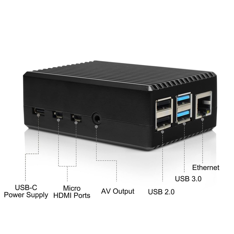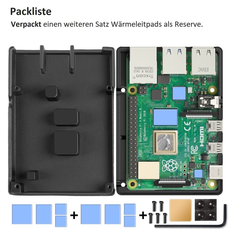 • Accessories: 1 x housing for Raspberry Pi 4B, 8 x thermal pads (4 pieces for backup), 1 x copper heat sink, 4 x screws with nuts.