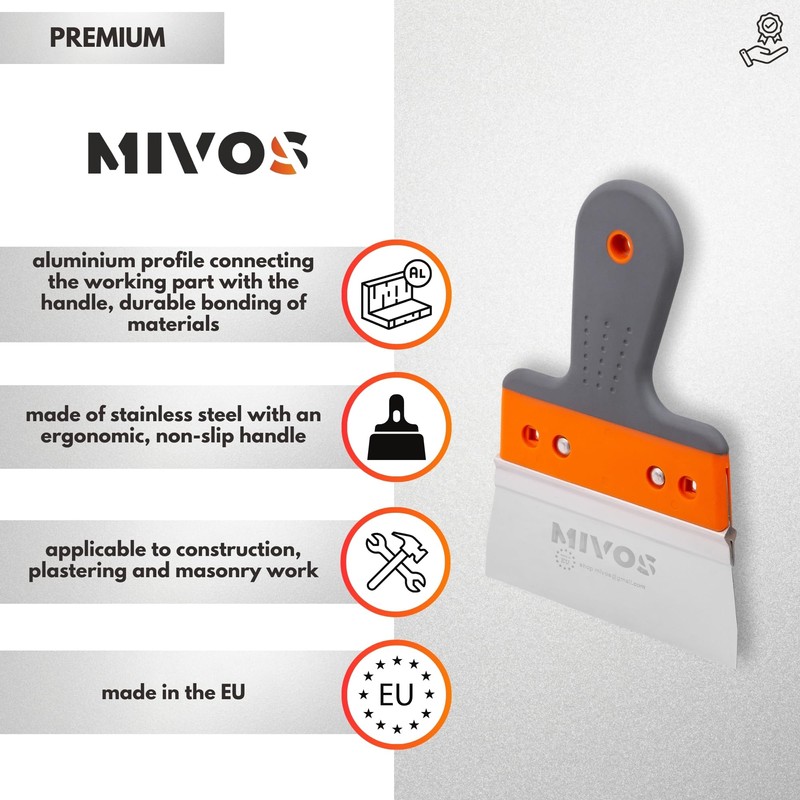 - Universal use: Mivos surface spatula made of stainless steel is perfect for applying and smoothing filler, plaster, plaster, cement and sealing material. With the help of a wide spatula, you can remove old paints and wallpaper quickly and easily. It is a mandatory tool in the tool box for any professional or craftsman