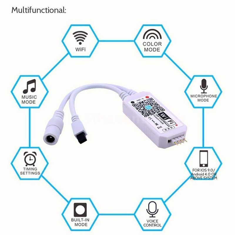 • Smart WiFi RGB Control Connector Turn all RGB strip lights into a smart light: save lighting presets, timers and control all your WiFi motivated lights from one APP; Change colors and get full control of your RGB lights from your phone with this simple WiFi control box via a free app "Magic Home" for iOS and Android users