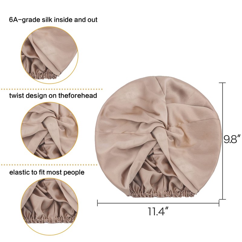 - El turbante de seda pura ayuda a proteger su cabello: nuestras gorras de turbante están hechas de seda de morera de 19 momme de grado 6A con certificación Oeko-Tex; La seda cubre tu cabello de abolladuras, roturas, enganches y fricción y pérdida de cabello, lo que mantendrá tu peinado bien durante toda la noche y ayudará a ahorrar tiempo a la mañana siguiente. No se deje engañar por la tela de raso barata que dice ser seda.