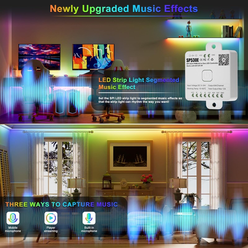 - 【Newly Upgraded Music Effect Modes】 LED Light strip music effect: You can configure multiple music effects on the same light strip according to their needs, and each section of the light bar can be selected with different music effects, different points, and can be set to correspond to the low, medium and high audio range.