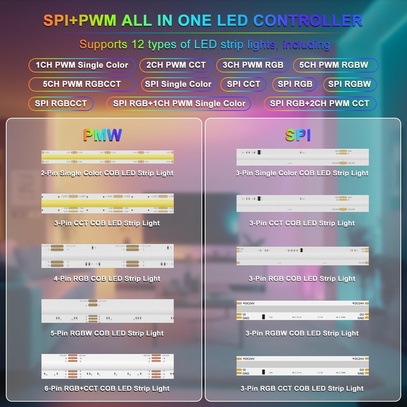 - 【Support PWM LED Strip】PWM LED strip which has no IC chip,for example COB,5050,SMD 2pin Single Color(V+ V-),3pin CCT(V+ CW WW),4pin RGB(V+ R G B),5pin RGBW(V+ R G B W),6pin RGB+CCT(V+ R G B CW WW).Note: Monochrome LED Light and CCT LED light have no function of DIY light effect.