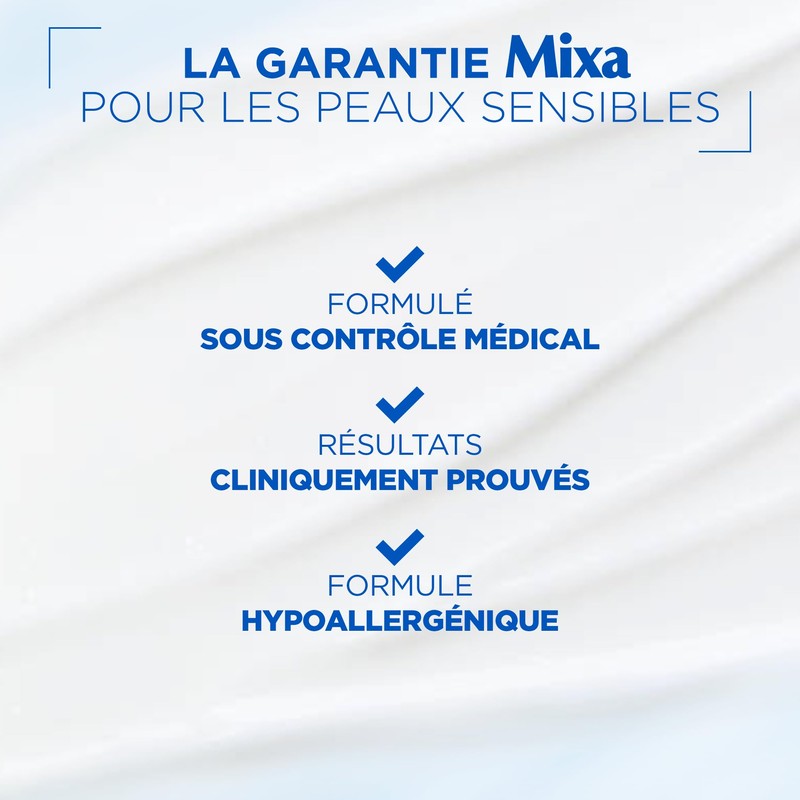 - MIXA -Guarantee: Tested under medical control. Clinically proven results. Hypoallergenic formula. Tested on 7000 sensitive skin