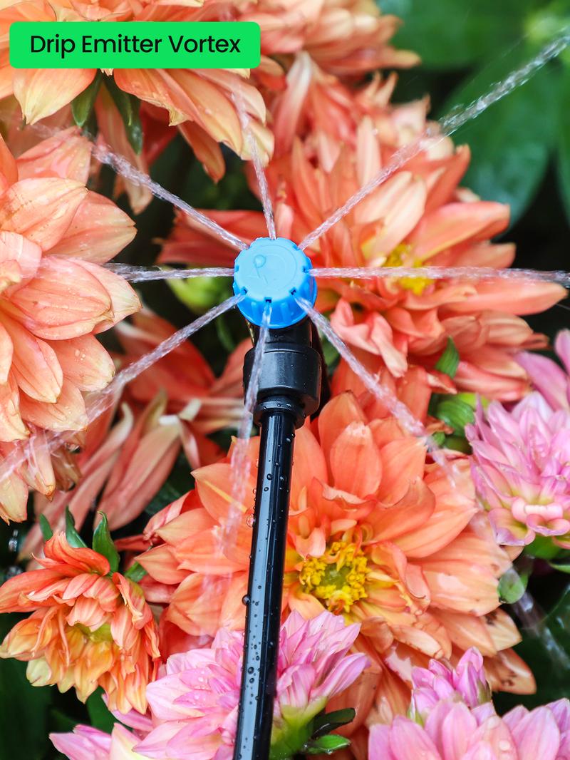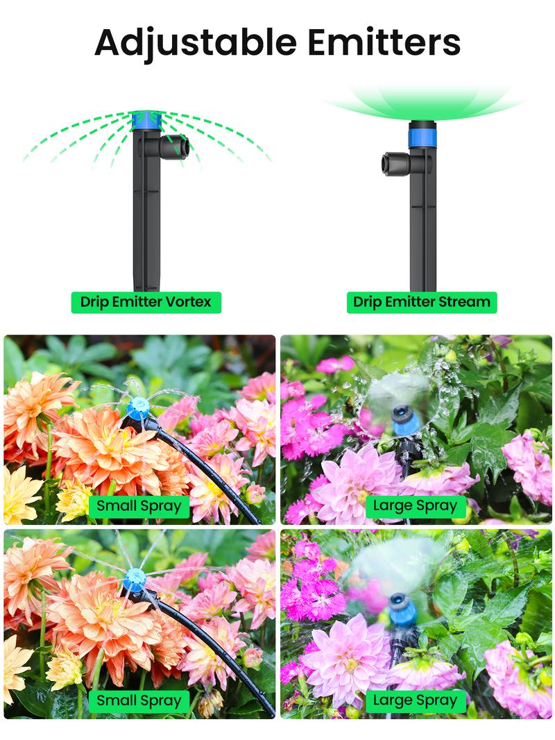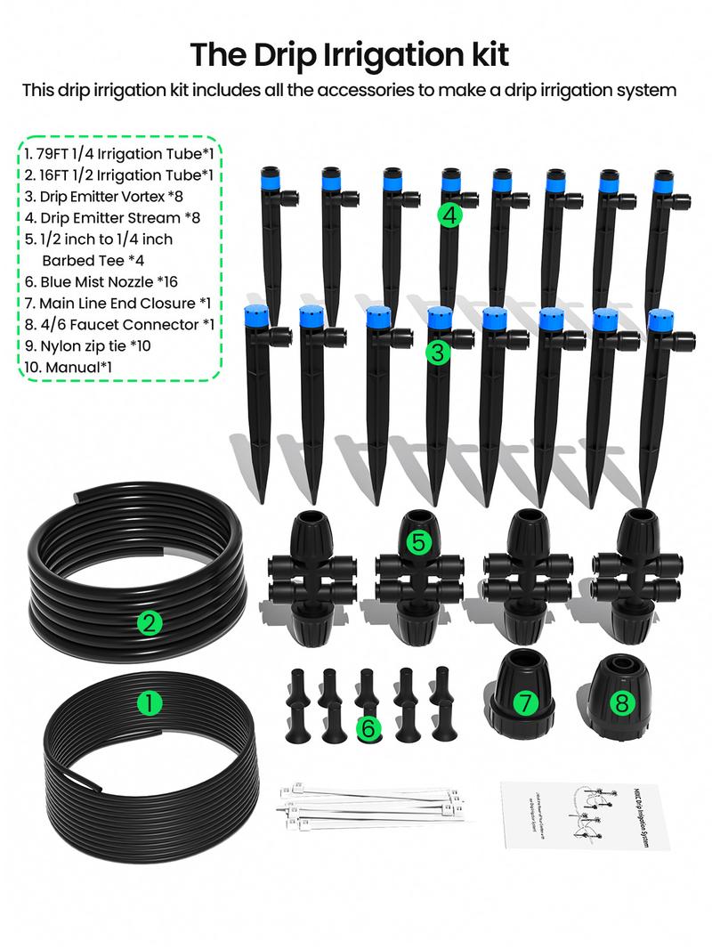 Complete Drip Irrigation Kit: This comprehensive garden watering system includes 1*79ft 1/4'' irrigation tube, 1*16ft 1/2'' irrigation tube, 4* barbed tees (1/2'' to 1/4''), 8 *drip emitter streams, 8 *drip emitter vortices, 1 *4/6 faucet connector, 1 *main line end closure, and 10* end closures. It's a one-stop solution for all your irrigation needs, transforming your garden into a lush oasis.