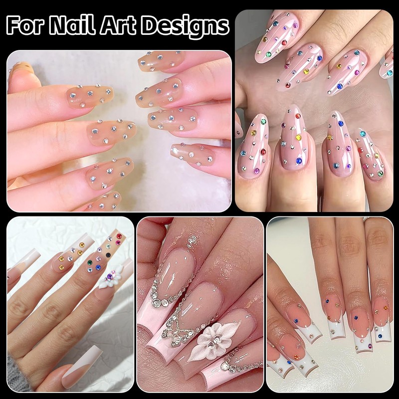 Mixed color nail flatback rhinestones for nails, crafts, nail art, clothes, shoes, jewelry, phone, card crafting, DIY craft, bags, wedding dress, books, guitar, cups, tablets, high heels, table scatter and so on. Meets all you need for a huge variety of dazzling nail-art designs