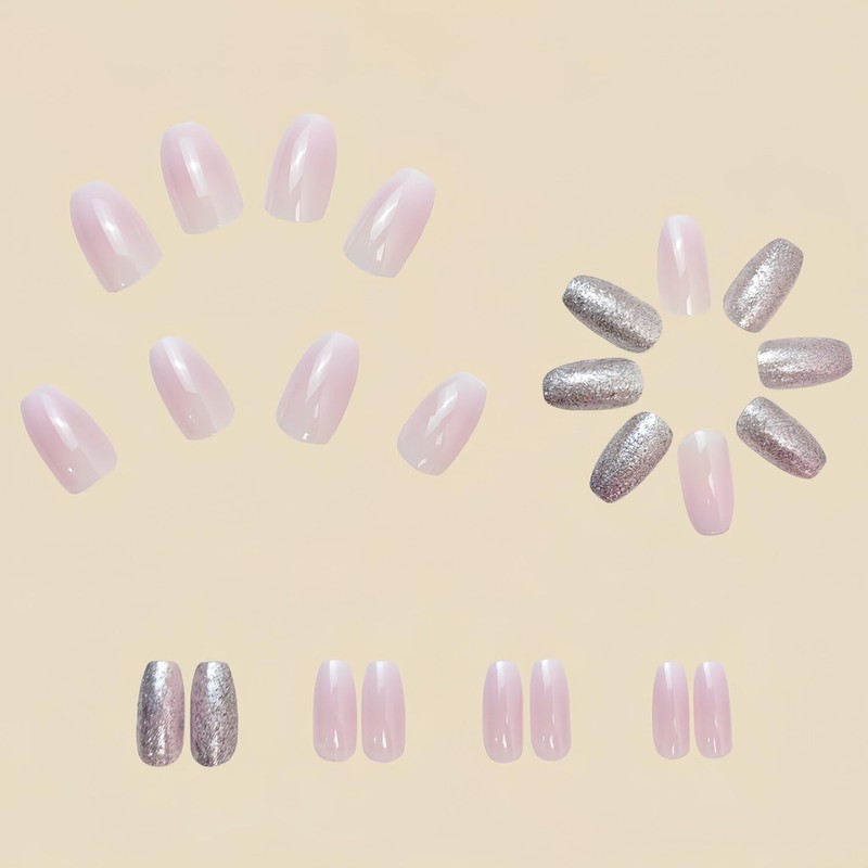 MIXFOSAHN Press on Nails Medium Square Fake Nails Silver Pink False Nails with Glitter Gradient Designs Glossy Full Cover Stick on Nails Glue on Nails Elegant Acrylic Nails for Women Girls 24 Pcs