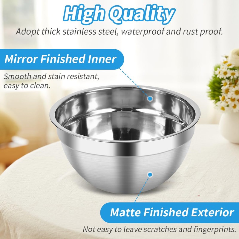 - Smart Design for Enhanced Convenience == Mixing bowl set crafted with smooth mirror finished inner and fingerprint-proof matte finished exterior, ensuring effortless cleaning. Stainless steel nesting bowls feature wide rims that provide a solid grip for comfortable handling. Plus, each mixing bowl with lid is equipped with a flat base, offering stability during use.