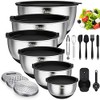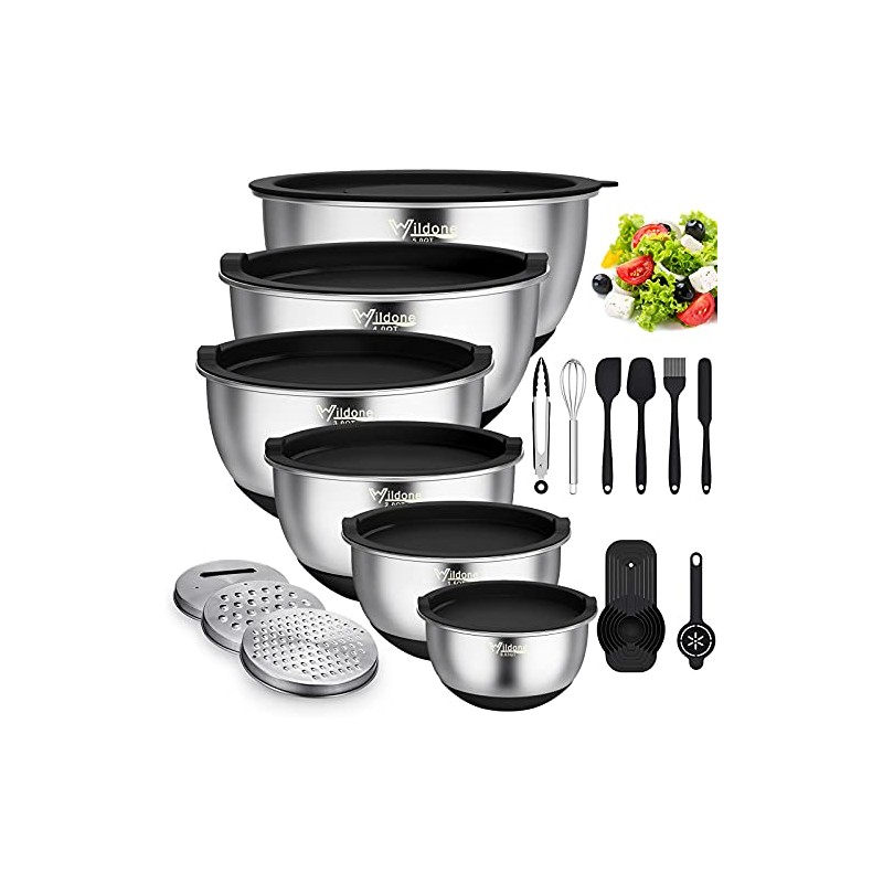 - 🍒Various Sizes for All Task - The mixing bowls set includes 6 sizes (0.63 / 1.5 / 2 / 3 / 4 / 5QT), making it simple to find the right bowl for any kitchen task or food storage need. With 3 grater attachments, basting brush, spreader spatula, flexible spatula, small spatula,egg whisk, egg separator,tong & 6 measuring spoons,the nested bowls are great for mixing,tossing, prepping, serving food all in one tool!