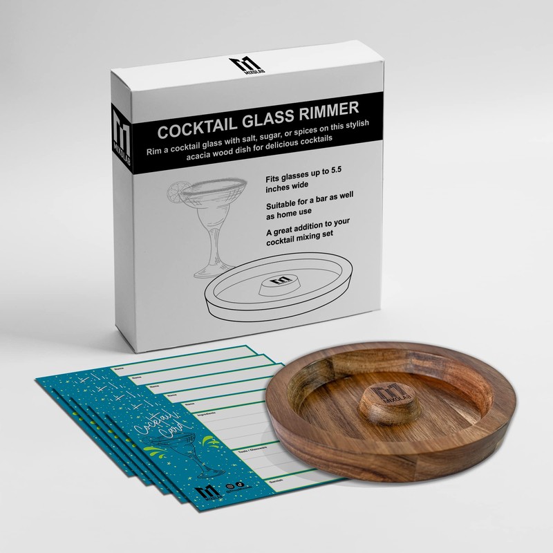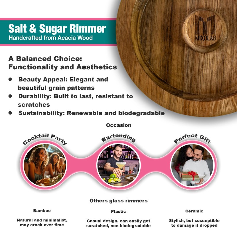 - Durable & Easy to Store: Crafted from premium-grade acacia wood, the Mixolab glass rimmer is both durable and modern. Its compact size makes it easy to store, and its natural wood grain adds a stylish touch to any home bar decor or bar cart