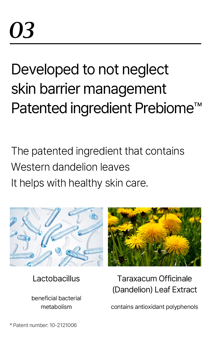 Contains five types of Centella Asiatica ingredients to quickly soothe skin exposed to UV rays. Contains various sizes of hyaluronic acid to provide deep moisture to the skin. The patented ingredient PREBIOME™, developed to ensure skin barrier care is not missed, contains dandelion leaf to help with healthy skin management. Based on key ingredients such as Centella Asiatica and hyaluronic acid, which help with soothing and moisturizing, it provides a comfortable and moist feel.