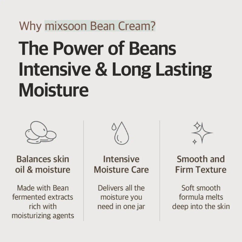 Mixsoon es una marca que ofrece una variedad de productos para el cuidado de la piel facial. Si buscás protegerla y mantenerla en forma, esta puede ser una buena opción. Libre de parabenos Los productos libres de parabenos son una buena opción para el cuidado de pieles sensibles o para quienes eligen productos sin conservantes artificiales. Mixsoon Bean Cream es una crema hidratante facial con extracto fermentado de soja que equilibra la hidratación y la producción de grasa, sin dejar sensación grasosa. Rica en antioxidantes y vitaminas C y E, fortalece la barrera cutánea y aporta vitalidad a la piel opaca. Beneficios: Hidratación profunda sin brillo grasoso Controla el exceso de sebo y equilibra la piel Mejora la elasticidad y textura Ideal para piel sensible, mixta, grasa, seca o madura Modo de uso: Aplicar después del suero, sobre rostro y cuello, masajeando suavemente. Ideal para rutina de día y noche.