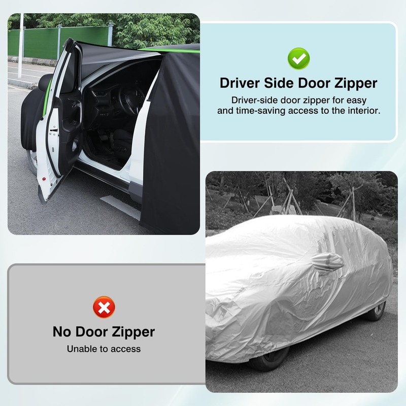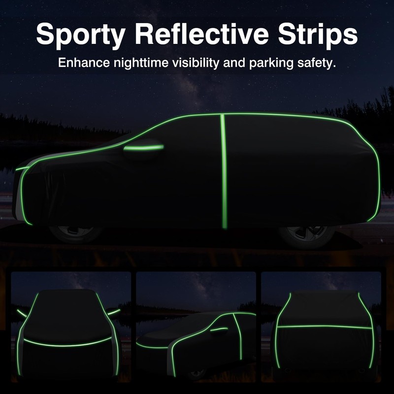 - Reflective Strips, Driver Door Zipper, Fixed Buckles: The reflective strips in the car cover enhance nighttime visibility and parking safety. Driver-side door zipper for easy and time-saving access to the interior. Windproof elasticized hem and 4 buckles secured to the wheels keep the car cover from blowing away on windy days.