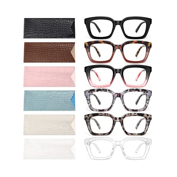 - Mixed 6-pack Readers: Contain six pairs of eyewear frames in black, transparency, blackpink, leopard print, tortoise shell, spotted, 6 soft cases, screen glasses cleaning cloth and blue light test kit