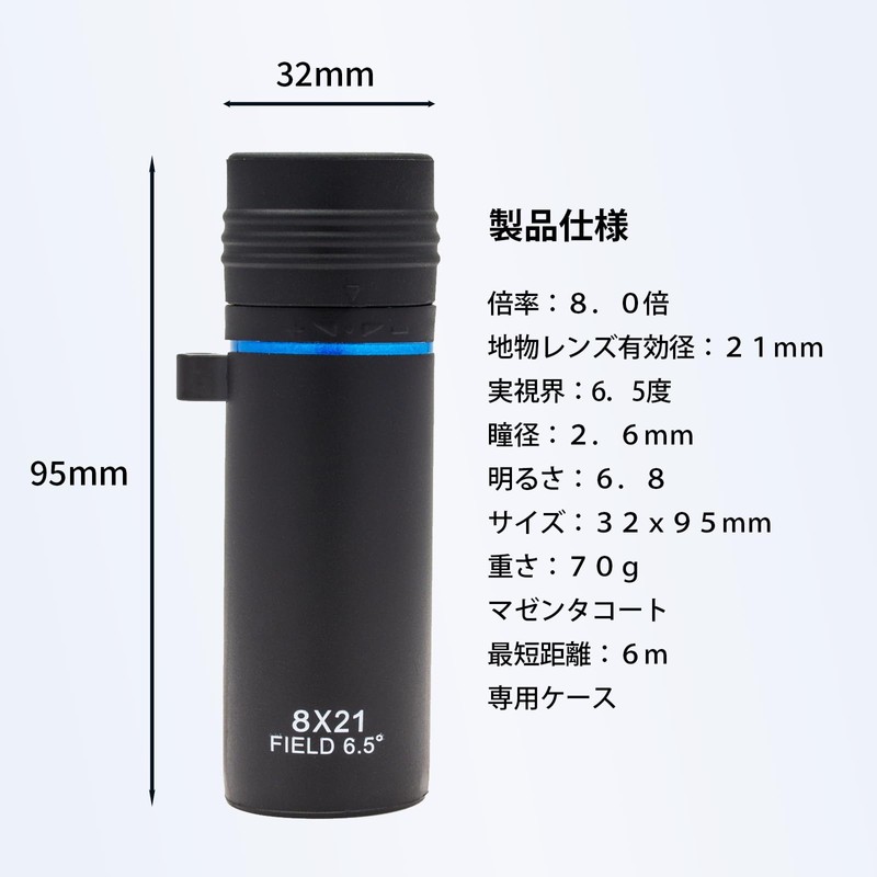 • Magnification: 8x; Objective lens diameter: 0.8 inches (21 mm); Brightness: 6.8
