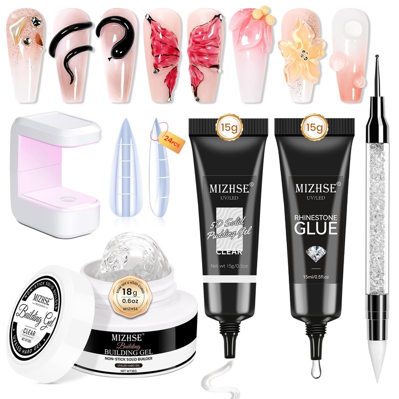 MIZHSE Solid Builder Nail Gel 3D Nail Gel and Rhinestone Glue for Nails Kit, Clear Sculpting Hard Carving Gels Builder Modeling Gels, No Wipe Kit Soak Off U V LED Nails Art Manicure Home