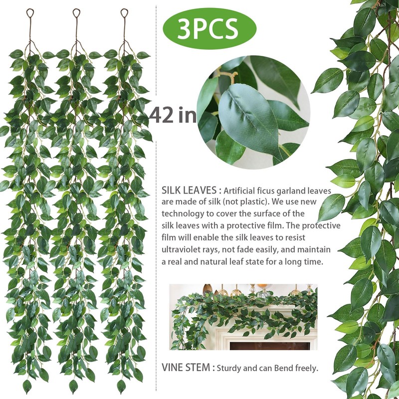 - SIZE - These beautiful artificial vine ficus greenery garland come in various sizes (3.5 feet, 6.5 feet) to choose from. You can purchase enough sizes and quantities according to the scene you want to decorate. Each vine has a hundreds of natural and realistic green leaves, very full and beautiful.