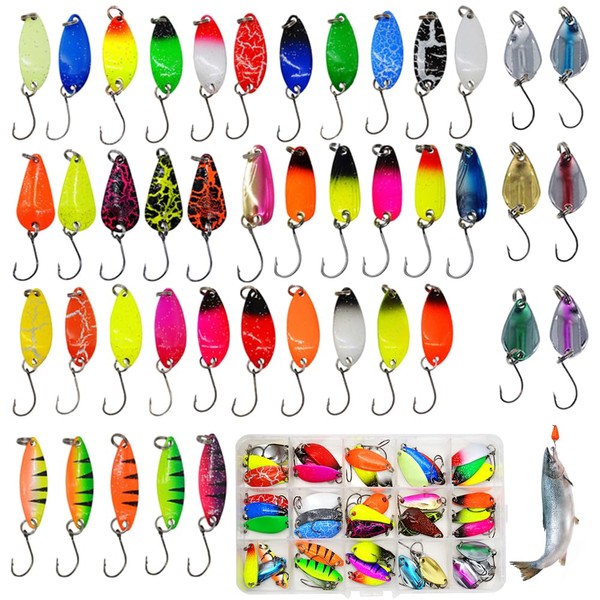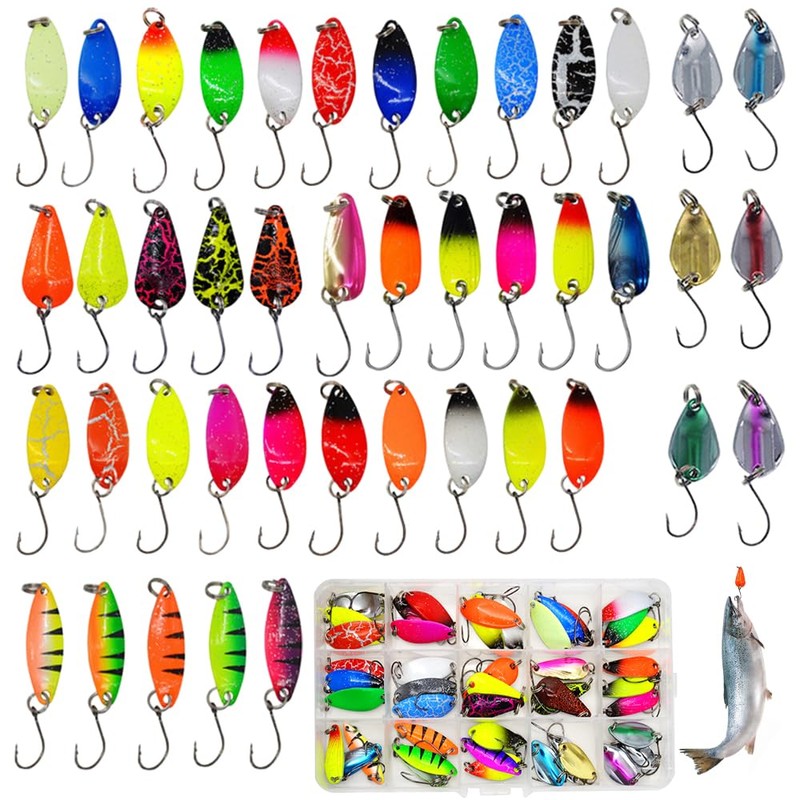 mizikuu 43 Stück Fishing Forellen Spoon, 2.0-3.5g Trout Fishing Spoon Blinker Angel Köder Set mit Box Forellenköder Farbig Köder Angelköder Spinner Angelköder für Haken Forellen Angeln