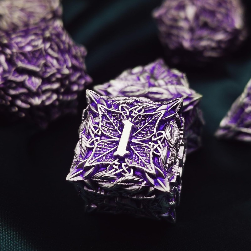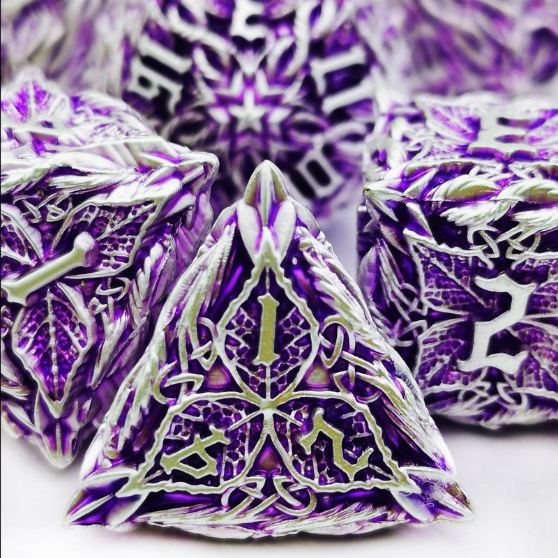 MJDICEOK Metal Dice Vine Leaf Set DND Dice 7 Polyhedral Role Playing Dice D&D Solid Dungeons and Dragons Dice (Silver Purple)