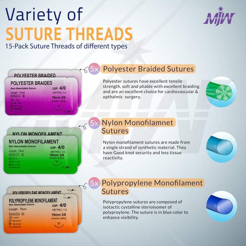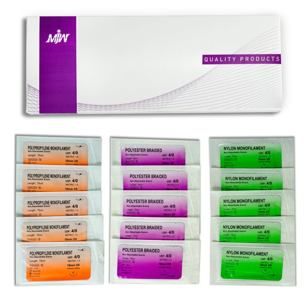 - ASSORTED SUTURE THREADS: The package has 15 mixed threads in total containing set of 5 Nylon Monofilament, 5 Polypropylene Monofilament and 5 Polyester Braided threads with 75 cm in length having USP 4/0. This assortment allows practitioners to familiarize themselves with different suture material.