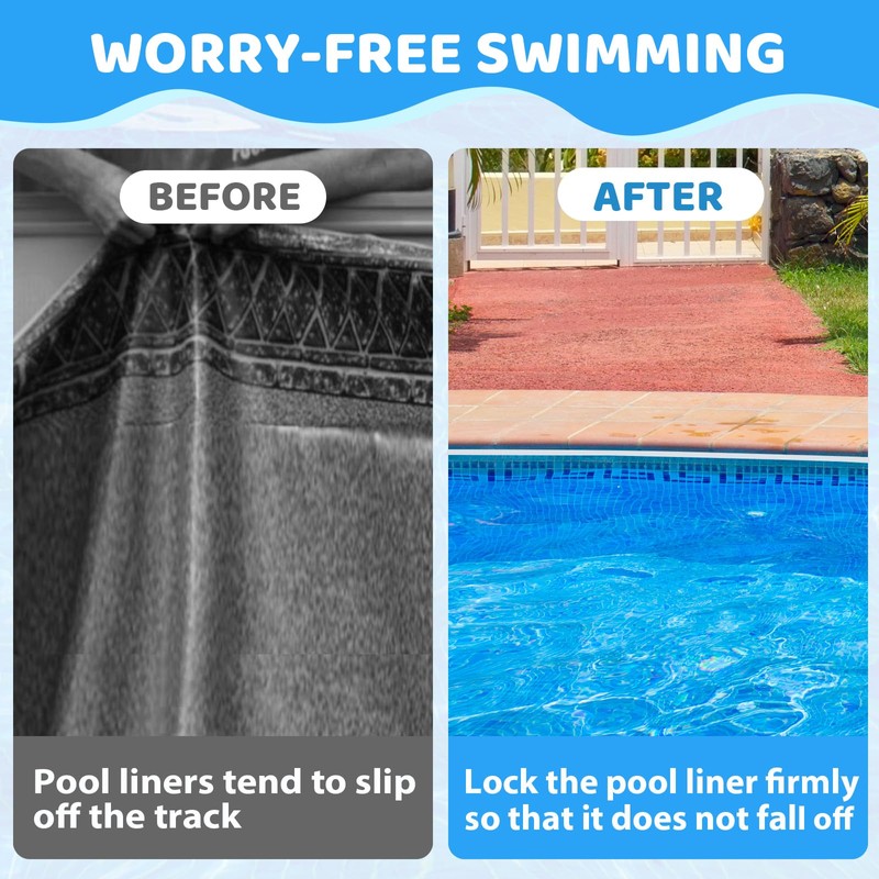 • Perfect Solution: After your swimming pool has been in use for a while, the pool liner can easily fall off from the edge of your pool. You need to use our pool liner lock to lock it between the top rail of the receiver track, ensuring that the pool liner is more firmly fixed in place and will not slip or shift
