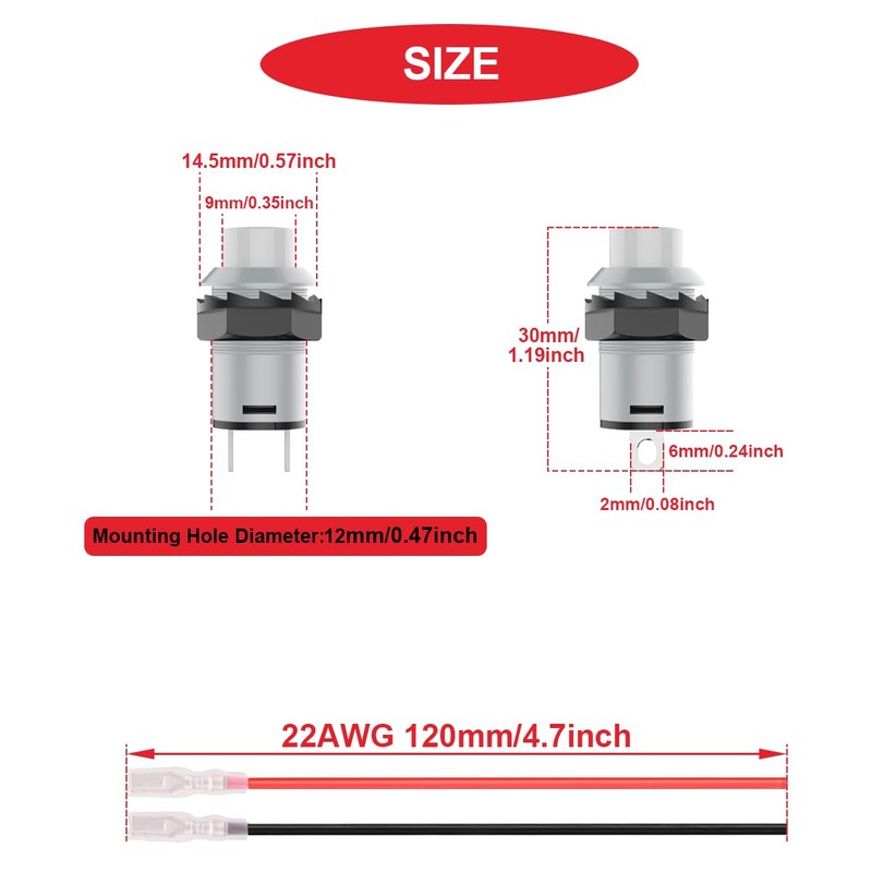 - SPECIFICATIONS:Operation Type:Self-latching;Terminals:2Pin;Polarity:SPST;Voltage And Current:AC 250V/1.5A; AC 125V/3A;Cable Length:120mm/4.7inch;Wire Gauge:22AWG;Push Button Hole Diameter:12mm;Push button hole thread: 0.75mm;Material:Plastic/Metal;Color:Grey.