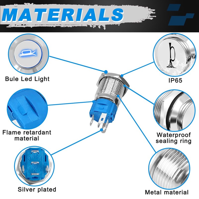 - 【Package Include】2PCS 16mm Horn Switch with Bule LED Light 2PCS with Pre-Wiring Connector 2PCS Rubber ring 10PCS Wiring Cap.