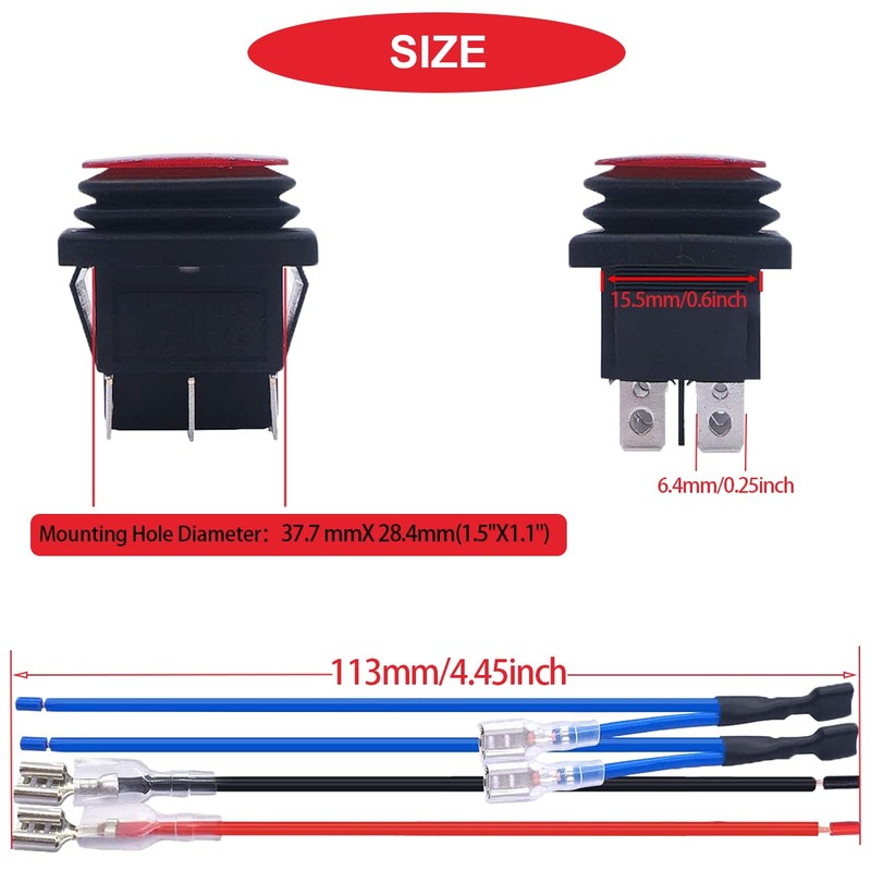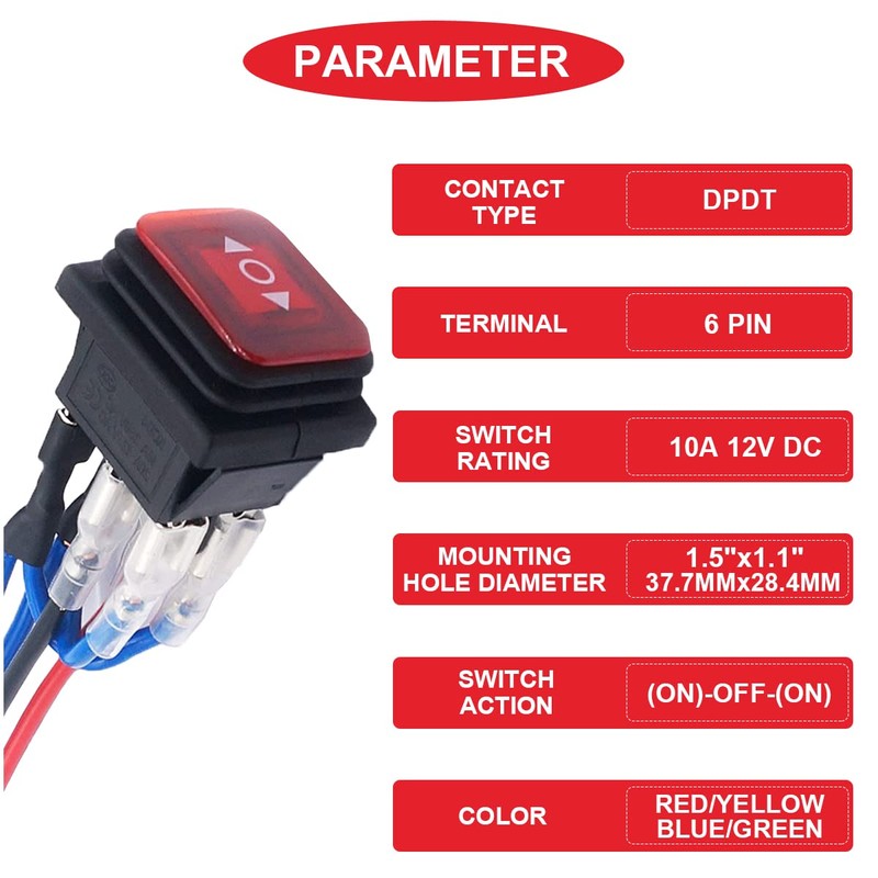 - 【Specification】Rated Voltage & Current: DC 12V 10A Position: 3(On)-Off-(On) Number of Pins: 6 Contact Type: DPDT Mounting Type: Panel Mount Mounting Hole Diameter: 37.7 x 28.4mm (L x W) Overall Size: 37.7x28.4x40mm (W*L*H) Wire Length: 100mm